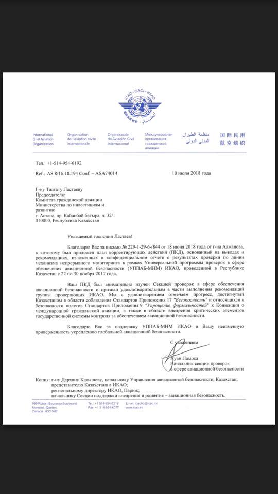 | В официальном письме ИКАО отмечается, достигнутый прогресс Казахстаном в области соблюдения стандартов Приложения 17 «Безопасность» и Приложения 9 «Упрощения формальностей» к Конвенции о международной гражданской авиации, а также высокие результаты в сфере внедрения критических элементов государственной системы контроля за обеспечением авиационной безопасности |